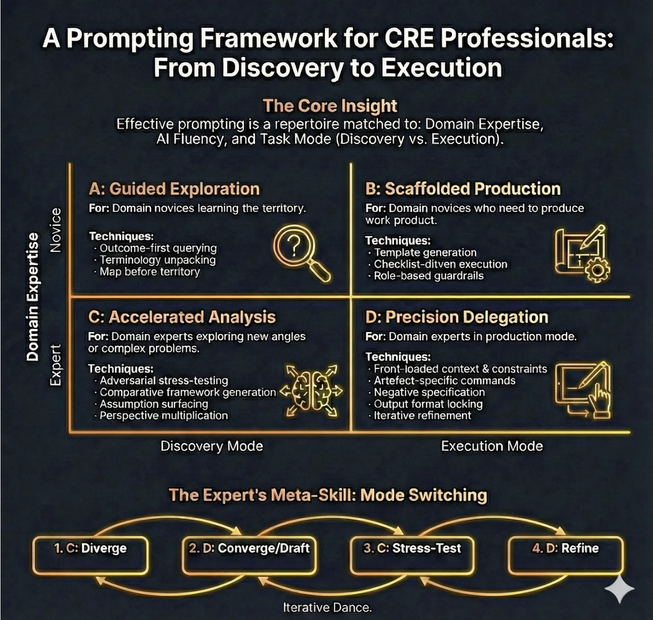 The ‘Prompting Framework for CRE Professionals’ is a practical framework for choosing how to prompt based on two realities of professional work: